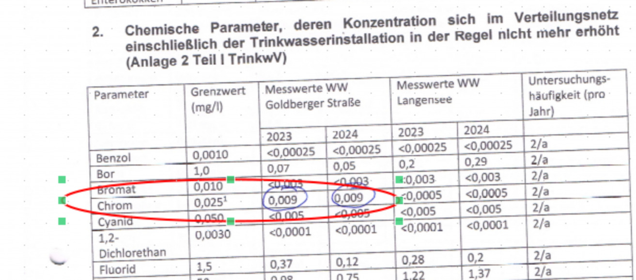 Im Güstrower Trinkwasser wurden in den Jahren 2023 und 2024 Konzentrationen des Schwermetalls Chrom festgestellt, jeweils 0,009 mg/l. Das geht aus dem Informationsschreiben der Stadtwerke an alle Güstrower Kunden vom 18.12.2025 hervor. Die Meßwerte überstiegen bereits jetzt den Grenzwert der TrinkwV von 0,005 mg/l, der ab dem 12.01.2030 gültig ist. Der derzeit gültige Grenzwert beträgt 0,025 mg/l.