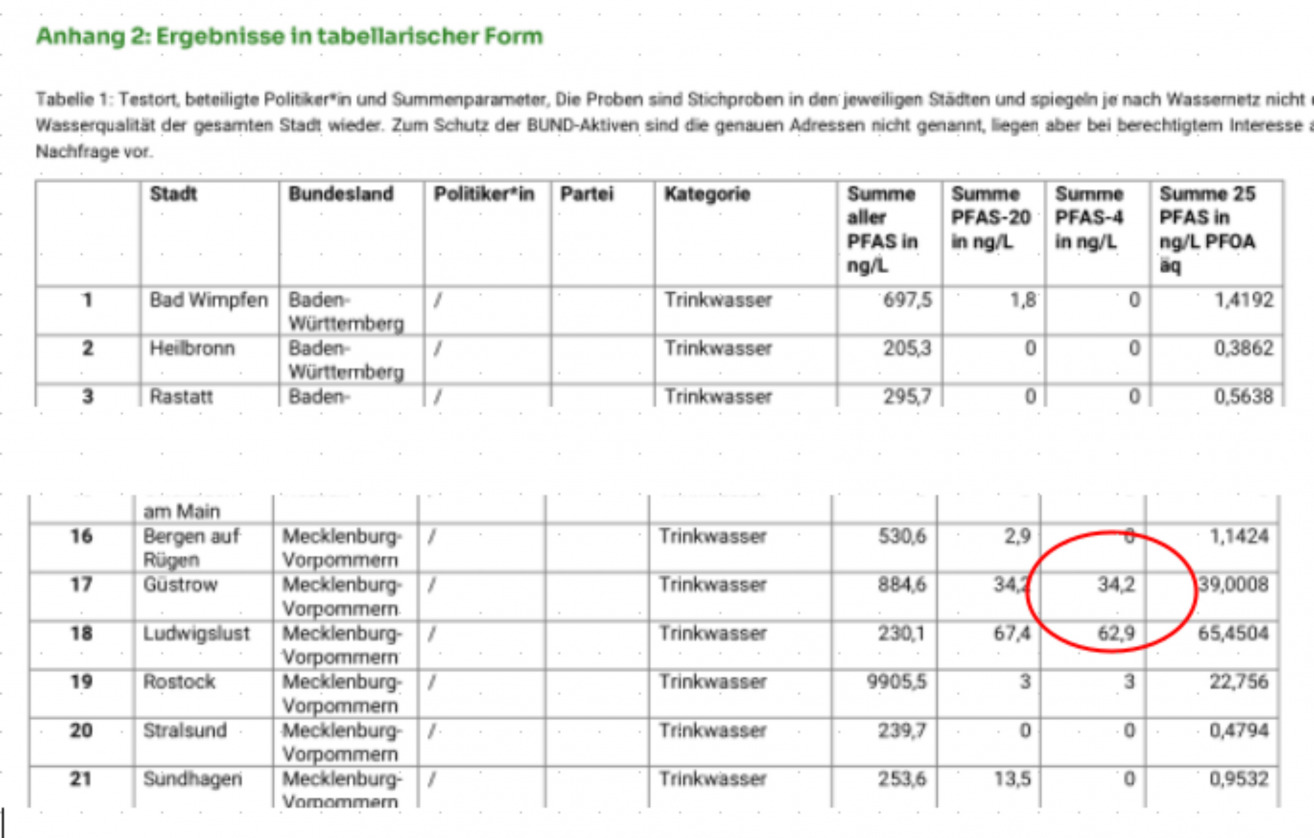 Im Güstrower Trinkwasser wird der ab dem 12.01.2028 gültige Grenzwert (lt. TrinkwV) für krebserregende Ewigkeits-Chemikalien „Summe PFAS-4“ von 0,000 020 mg/l jetzt schon überschritten. Der gemessene Wert liegt bei 0,000 0342 mg/l. Der Messwert wurde vom BUND e.V. am 04.11.2025 veröffentlicht.