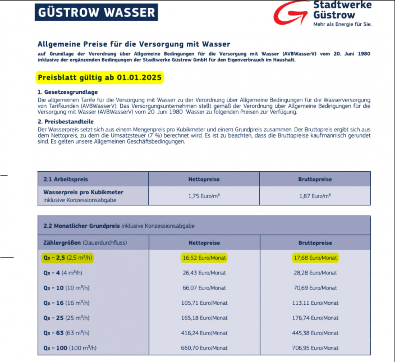 Im Juli 2025 haben wir unsere Wasserrechnung erhalten. Trotz der Preissteigerung zum Anfang des Jahres, schien uns der Rechnungsbetrag dennoch überhöht. Die Prüfung ergab, dass die Stadtwerke Güstrow ein Preisblatt als Abrechnungsgrundlage verwenden, dass weder zum Jahreswechsel veröffentlicht wurde noch im Pressegespräch mit der SVZ/Nordkurier im Dezember 2024 eine Rolle spielte.