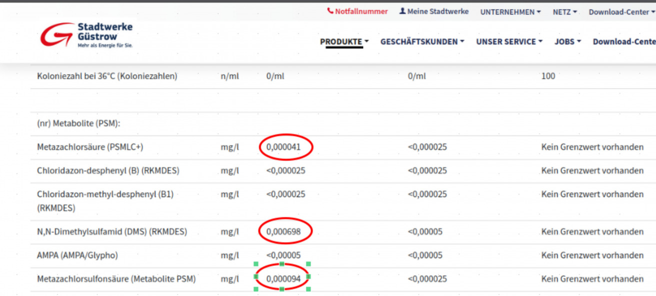 Im Güstrower Trinkwasser sind lt. der Internetseite der Stadtwerke Pestizidrückstände enthalten, welche unseres Erachtens per se im Trinkwasser problematisch sind, obwohl es keinen Grenzwert gibt und Orientierungswerte nicht überschritten werden: