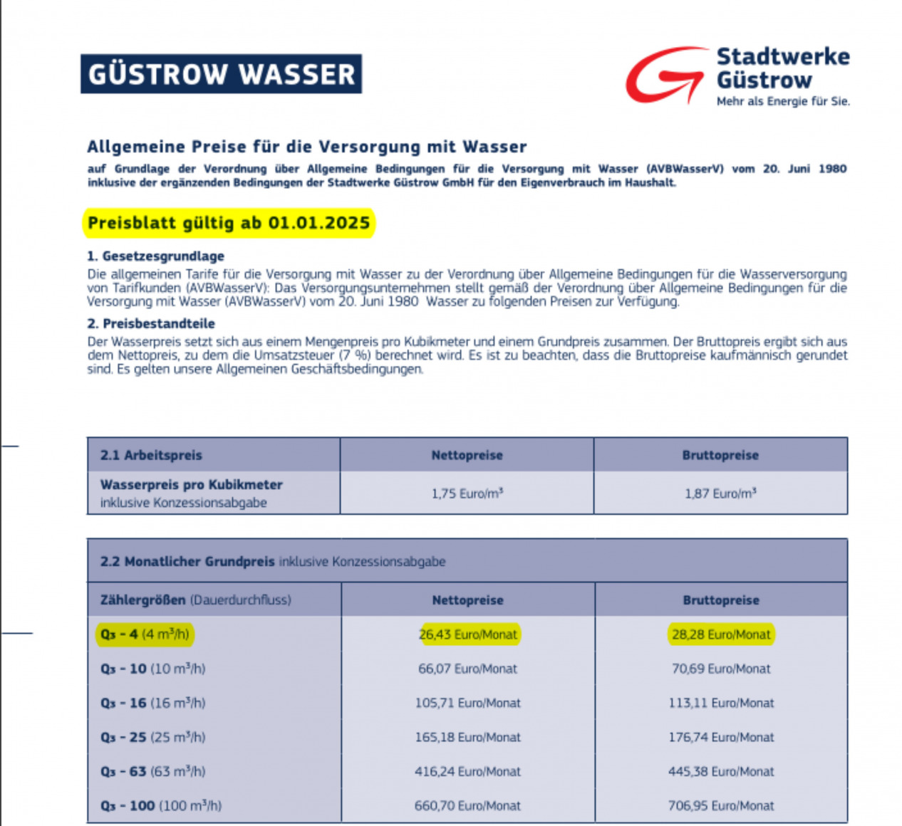 Im Juli 2025 haben wir unsere Wasserrechnung erhalten. Trotz der Preissteigerung zum Anfang des Jahres, schien uns der Rechnungsbetrag dennoch überhöht. Die Prüfung ergab, dass die Stadtwerke Güstrow ein Preisblatt als Abrechnungsgrundlage verwenden, dass weder zum Jahreswechsel veröffentlicht noch im Pressegespräch mit der SVZ/Nordkurier im Dezember 2024 eine Rolle spielte.